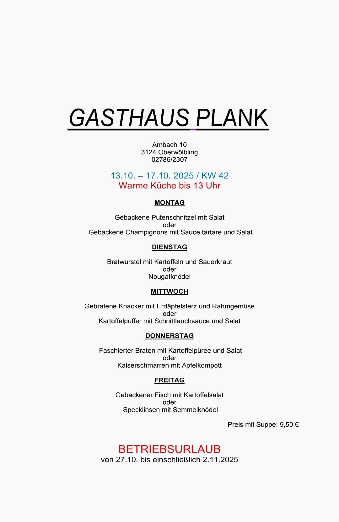 Am Rande des Dunkelsteinerwaldes besteht seit ca. 1870 der Gasthof Plank, nun schon in der 4. Generation. Bei uns erwartet Sie köstliche Hausmannskost in angenehmer Atmosphäre. Im Sommer können Sie an schönen Tagen Ihre Zeit in unserem gemütlichen Gastgarten verbringen, während Sie dem leisen Rauschen des kleinen Bächleins lauschen. Unsere kleine Ortschaft liegt direkt zwischen St. Pölten und Krems (Wachau) und ist ein idealer Ausgangspunkt für diverse Ausflüge. Unser schönes Traisental lädt Sie auch gerne für Radtouren bzw. für schöne Wanderungen im Dunkelsteinerwald ein.
